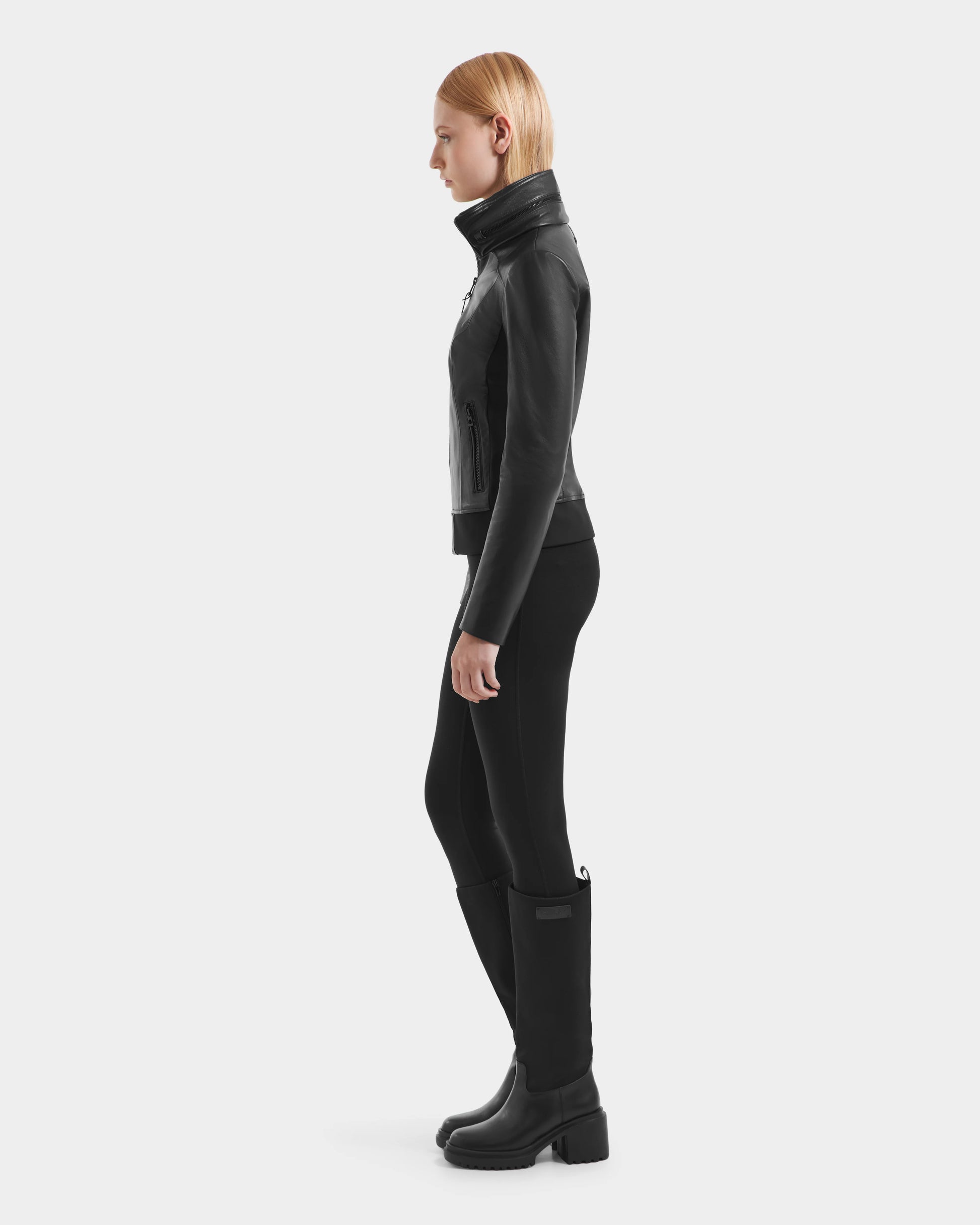 The REBECCA by RUDSAK is a must-have fitted lamb leather jacket that combines sporty sleekness with timeless design. Crafted from supple leather, this moto-inspired bomber features tonal black hardware for a modern, streamlined look. Designed with a high-neck collar and a zippered lightweight hideaway hood, it offers both practicality and style. An elevated essential, the REBECCA is the perfect layer to transition seamlessly through the seasons.