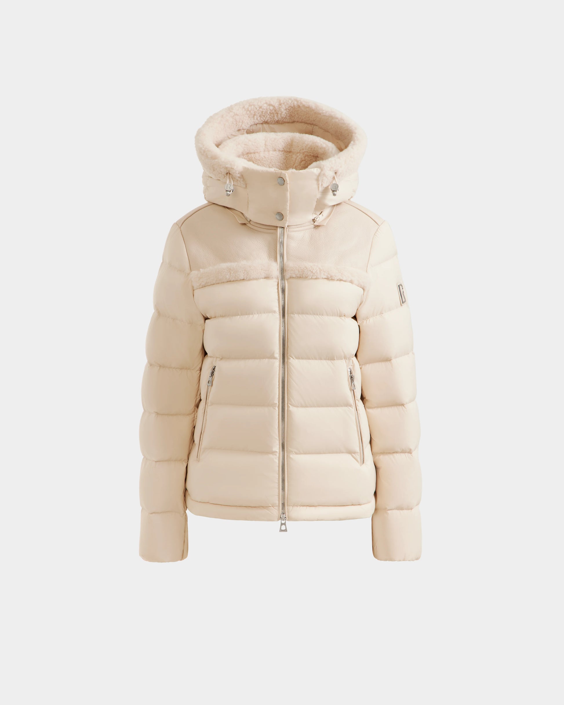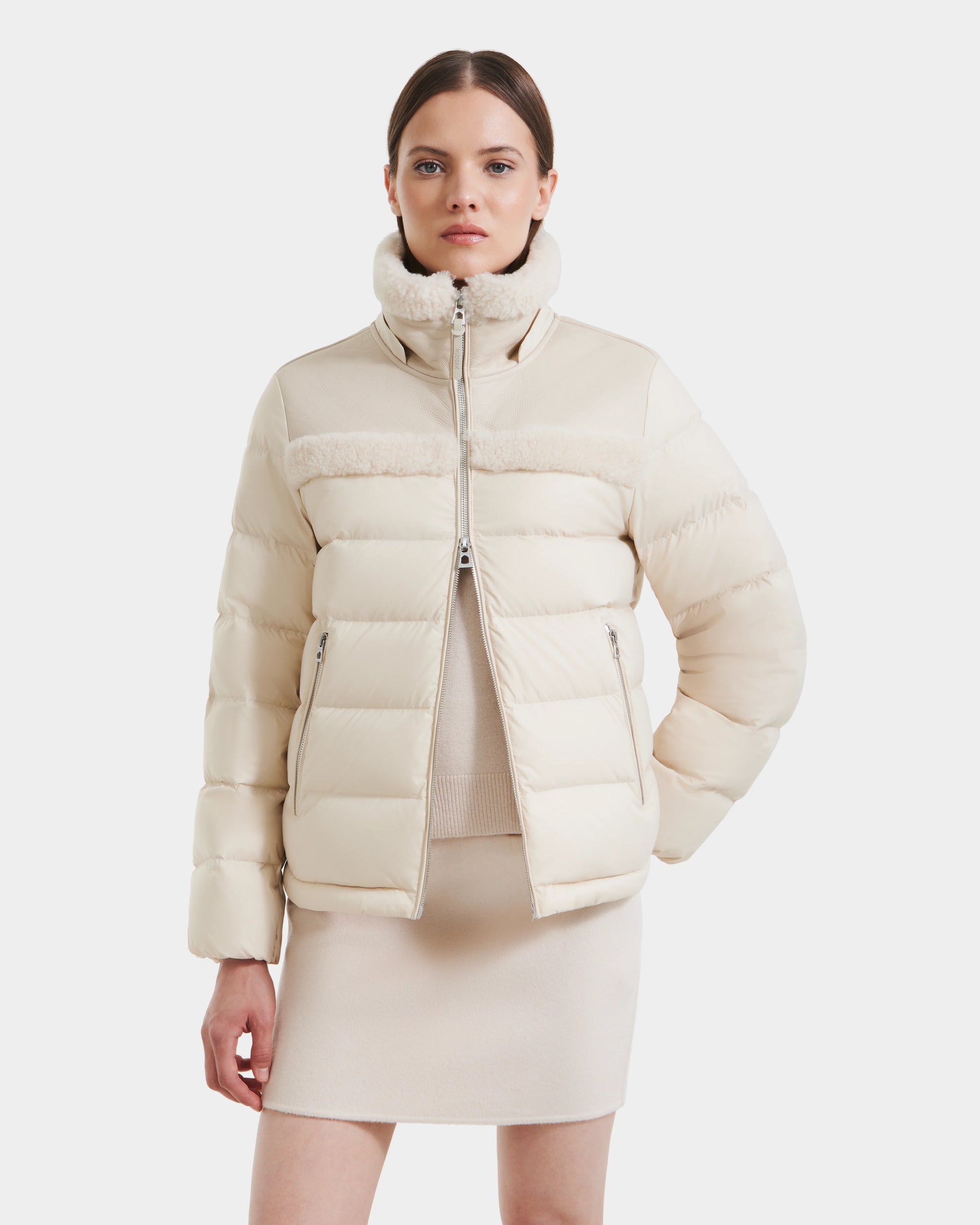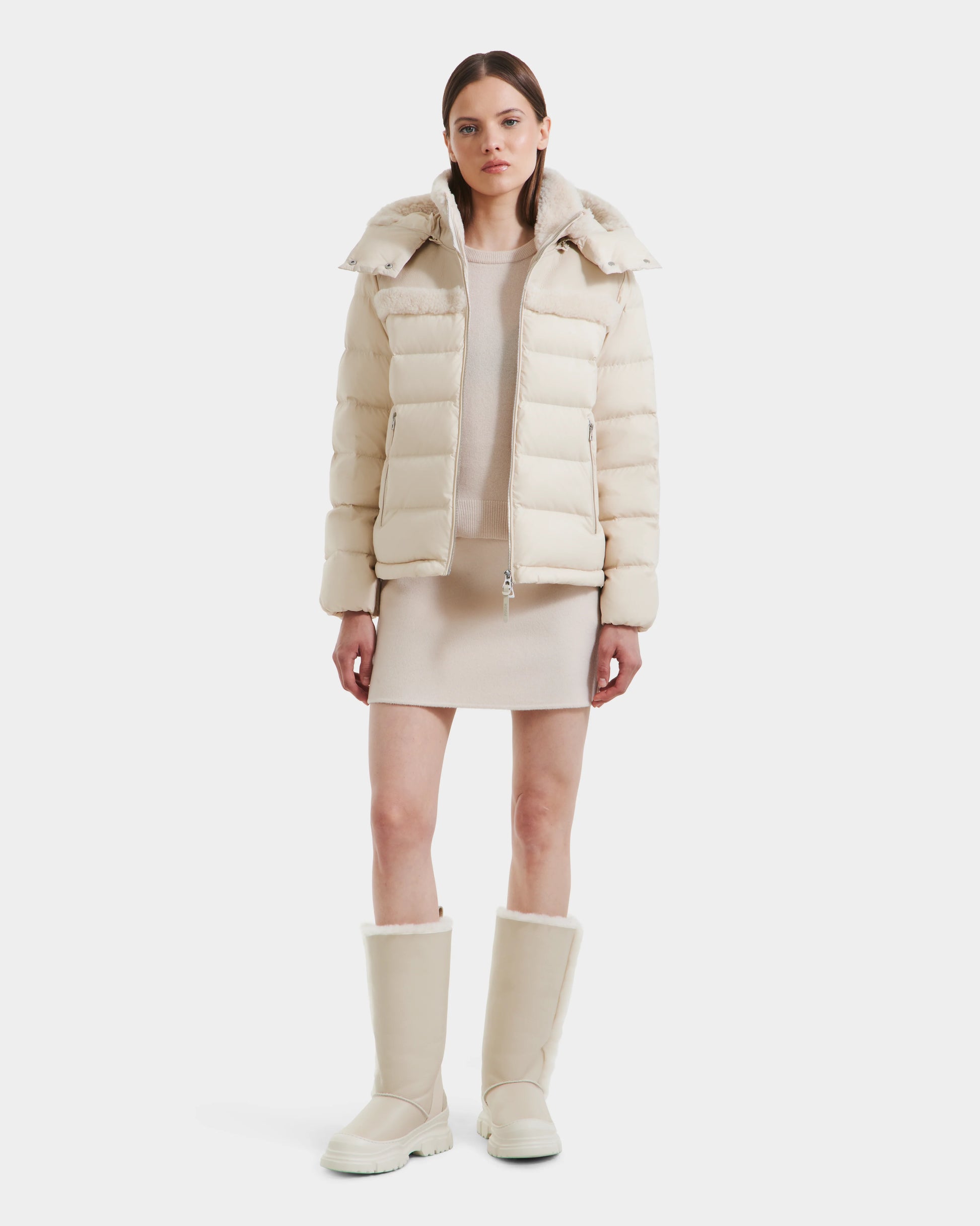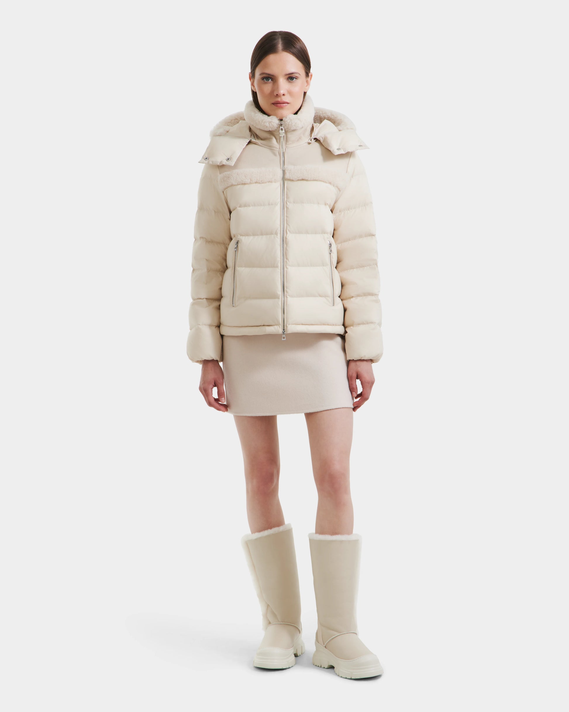 The SANDRA by RUDSAK is a women’s shearling combo puffer jacket designed to deliver elevated warmth with contemporary style. Crafted from plush shearling with a recycled nylon shell and lining, it offers lightweight insulation with responsibly sourced down and feather fill. The sleek, quilted silhouette is accented with soft shearling details for a refined, modern look. Perfect for cool days and city layering, SANDRA combines functionality and luxurious texture for confident, everyday wear.