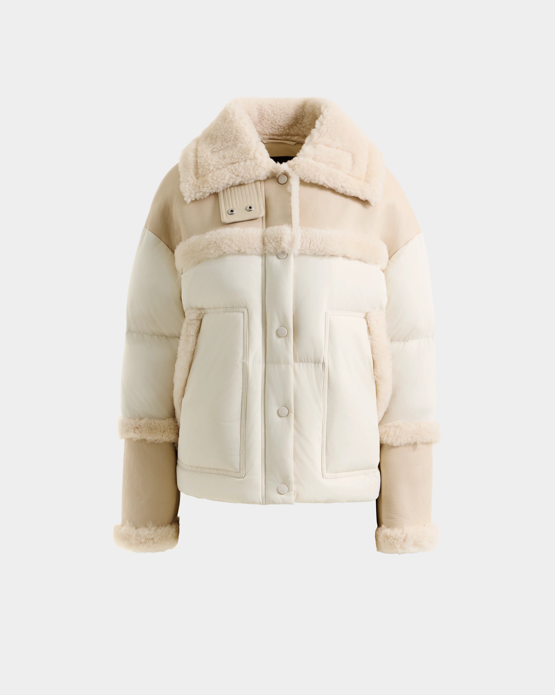 SHIRLEY by RUDSAK is a modern statement in soft contrast and plush protection. This women’s down jacket features a luxurious shearling body offset by matte nylon panels and sleek trims for a textural, tone-on-tone look. Its high-loft down fill delivers lightweight warmth, while the cropped silhouette and sharp collar add directional edge. Designed to turn heads from city strolls to chic chalet moments, SHIRLEY is winterwear redefined—bold, feminine, and effortlessly elevated.