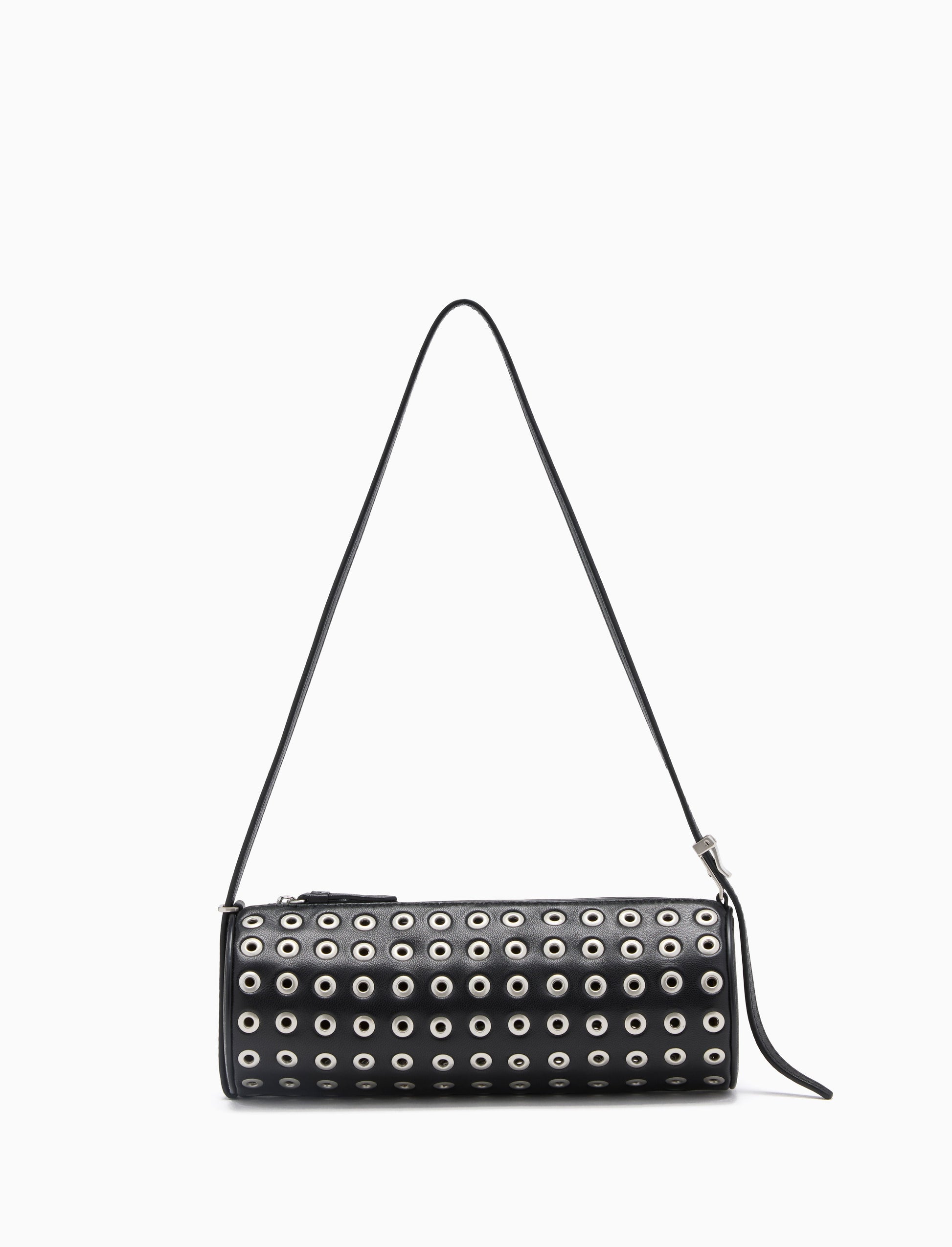 The Silo Bag is crafted in soft nappa leather and studded with silver-tone grommets throughout. Features a small, non-rigid barrel shape with functional slider hardware. This versatile silhouette can be worn in two ways: as a traditional shoulder bag or by sliding the strap through the ring to create an elongated shape.