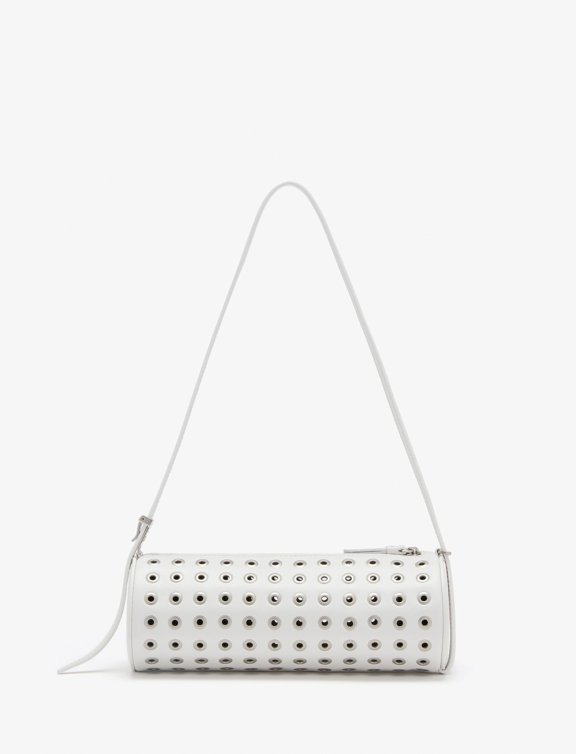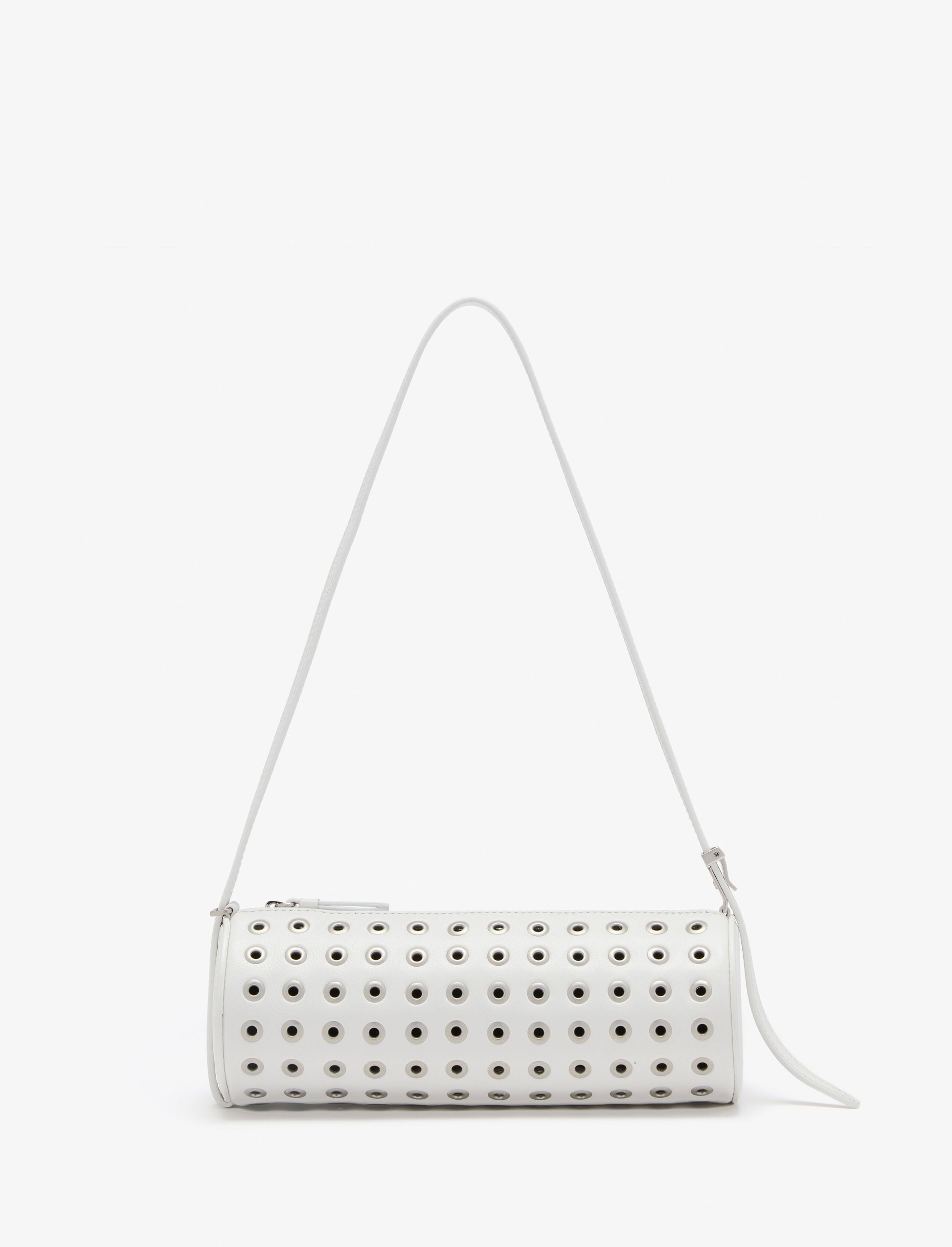 The Silo Bag is crafted in soft nappa leather and studded with silver-tone grommets throughout. Features a small, non-rigid barrel shape with functional slider hardware. This versatile silhouette can be worn in two ways: as a traditional shoulder bag or by sliding the strap through the ring to create an elongated shape.