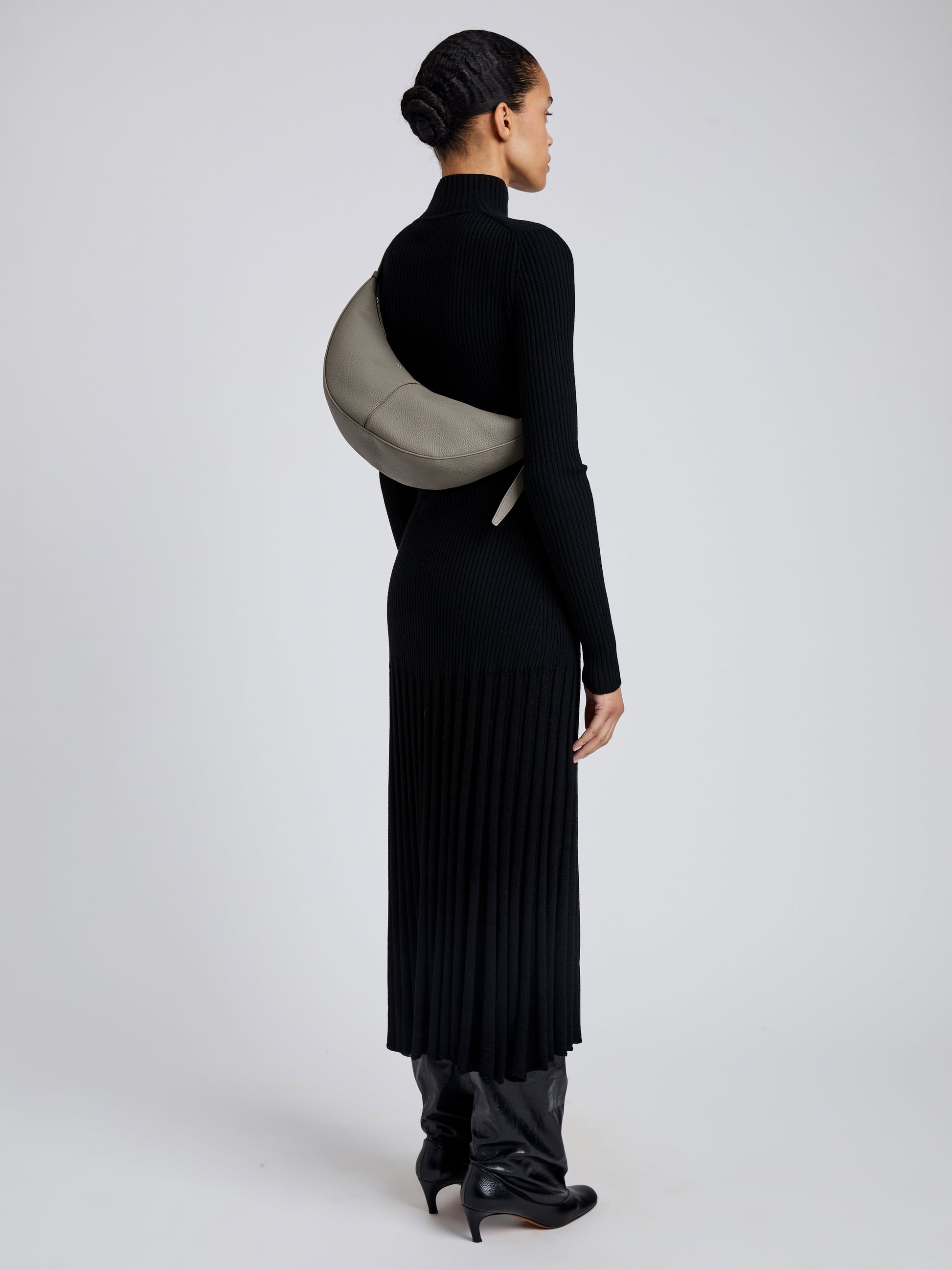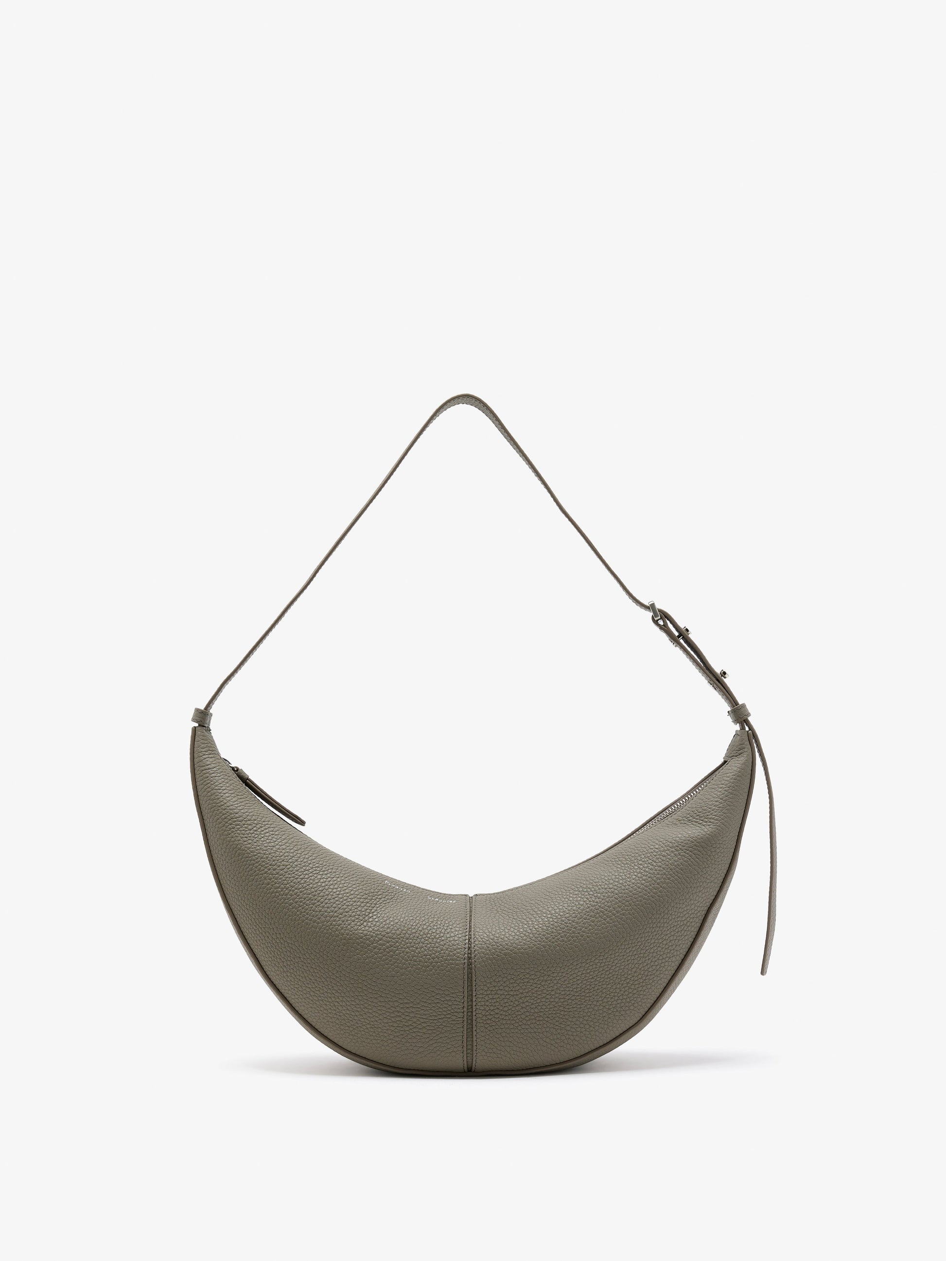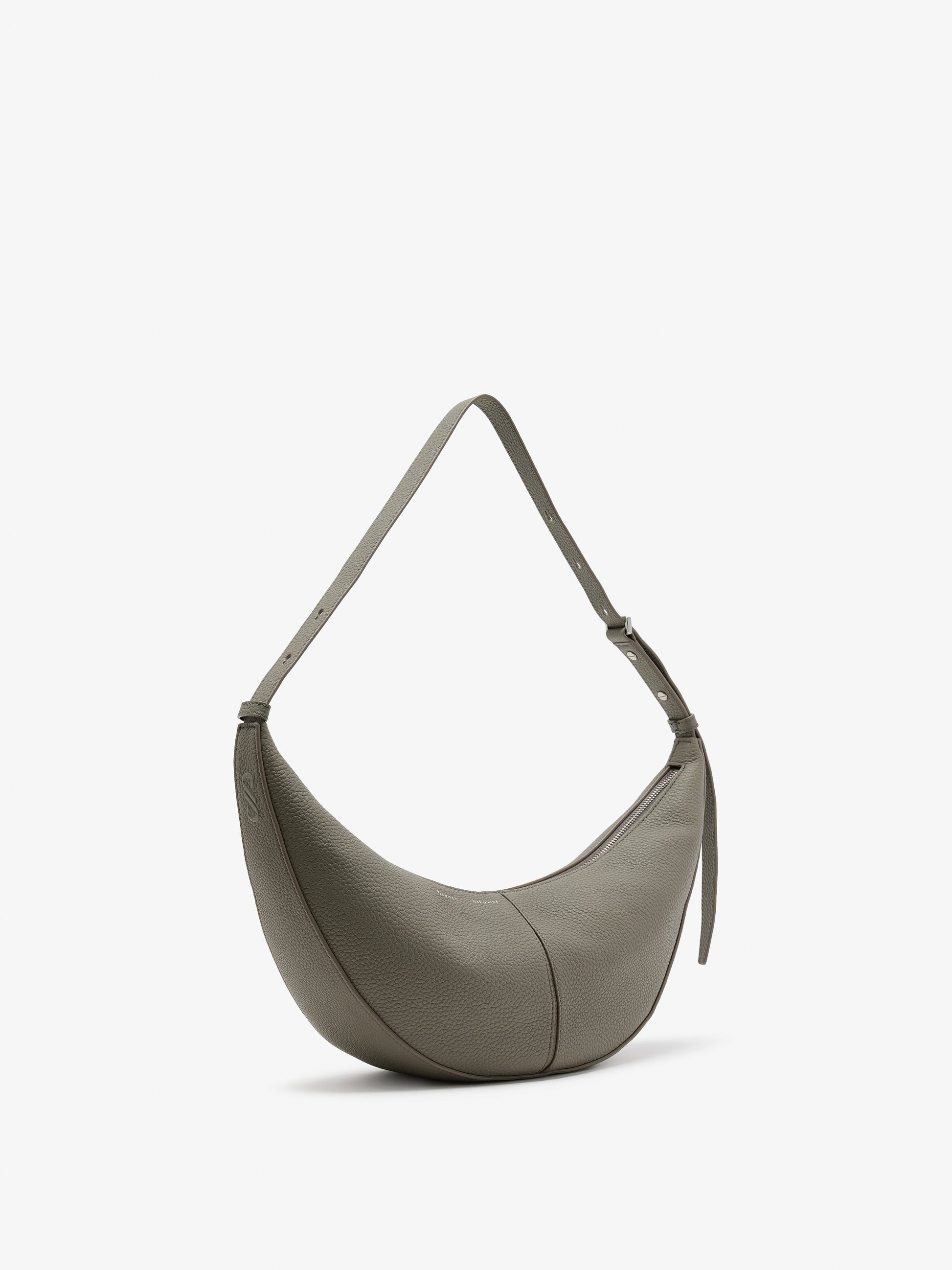 The Slide Bag is crafted in soft pebbled calf to a curved silhouette that functions as both a long strap or true shoulder bag. Tighten the straps to create a rounded shape or wear as a more relaxed arch. Finished with collar studs along the strap and a monogram detail at the base of the bag.