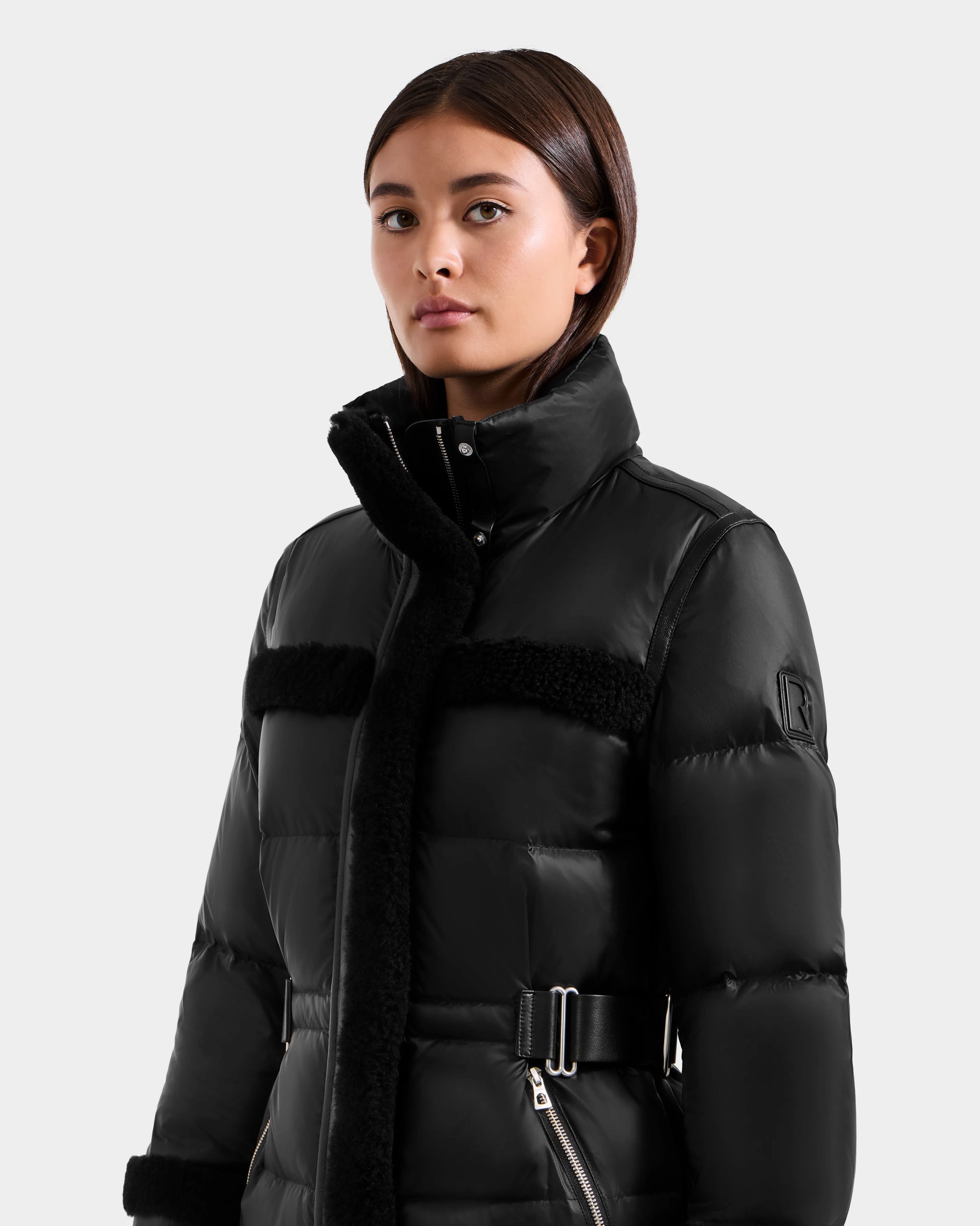 The TESSA by RUDSAK is a women’s mid-length down puffer that fuses warmth with luxury design. Filled with RDS-certified down, it’s crafted with quilted panels and plush shearling trim for elevated texture. Adjustable side fasteners define the waist, while the removable hood adds versatility. Zipper pockets ensure function without compromising style. A modern take on a classic silhouette, TESSA is a statement winter essential designed for both urban dressing and après-ski chic.