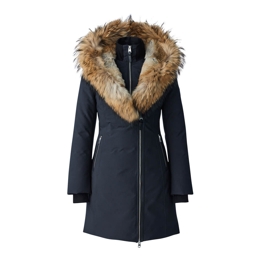 TRISH-F is a Powder Touch down coat for women with a Signature Collar with natural fur and a windproof shell. Water resistant, repellent, and breathable, it is expertly tailored to a fitted silhouette and features a distinctive asymmetrical zip closure for avant-garde styling. Storm cuffs and an inner ribbed bib add extra warmth in extreme weather. A bold style statement with protective comfort.