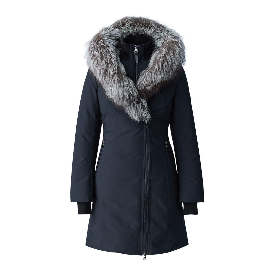 TRISH-X is a Powder Touch down coat for women with a Signature Collar with silver fox fur and a windproof shell. Water resistant, repellent, and breathable, it is expertly tailored to a fitted silhouette and features a distinctive asymmetrical zip closure for avant-garde styling. Storm cuffs and an inner ribbed bib add extra warmth in extreme weather. A bold style statement with protective comfort.