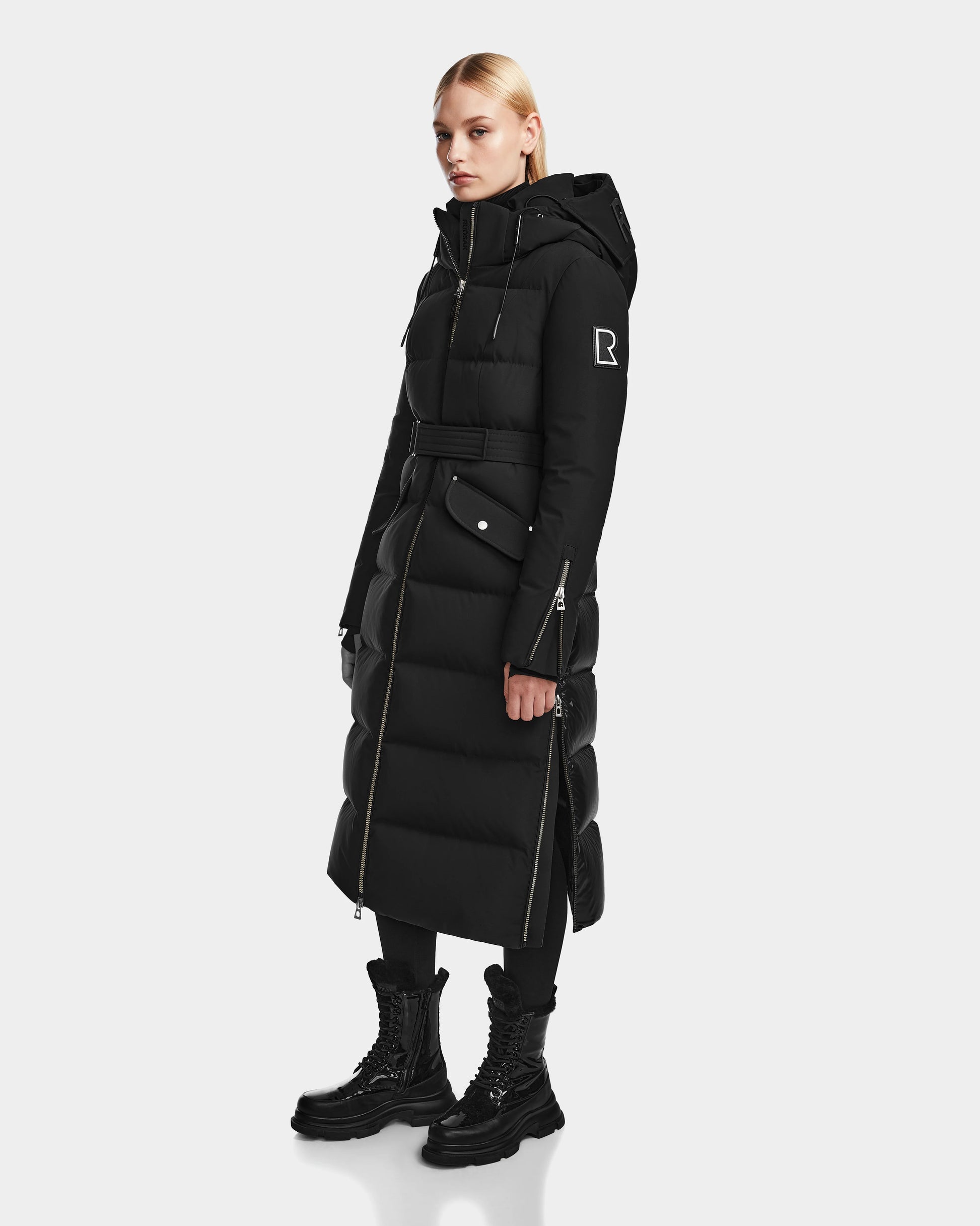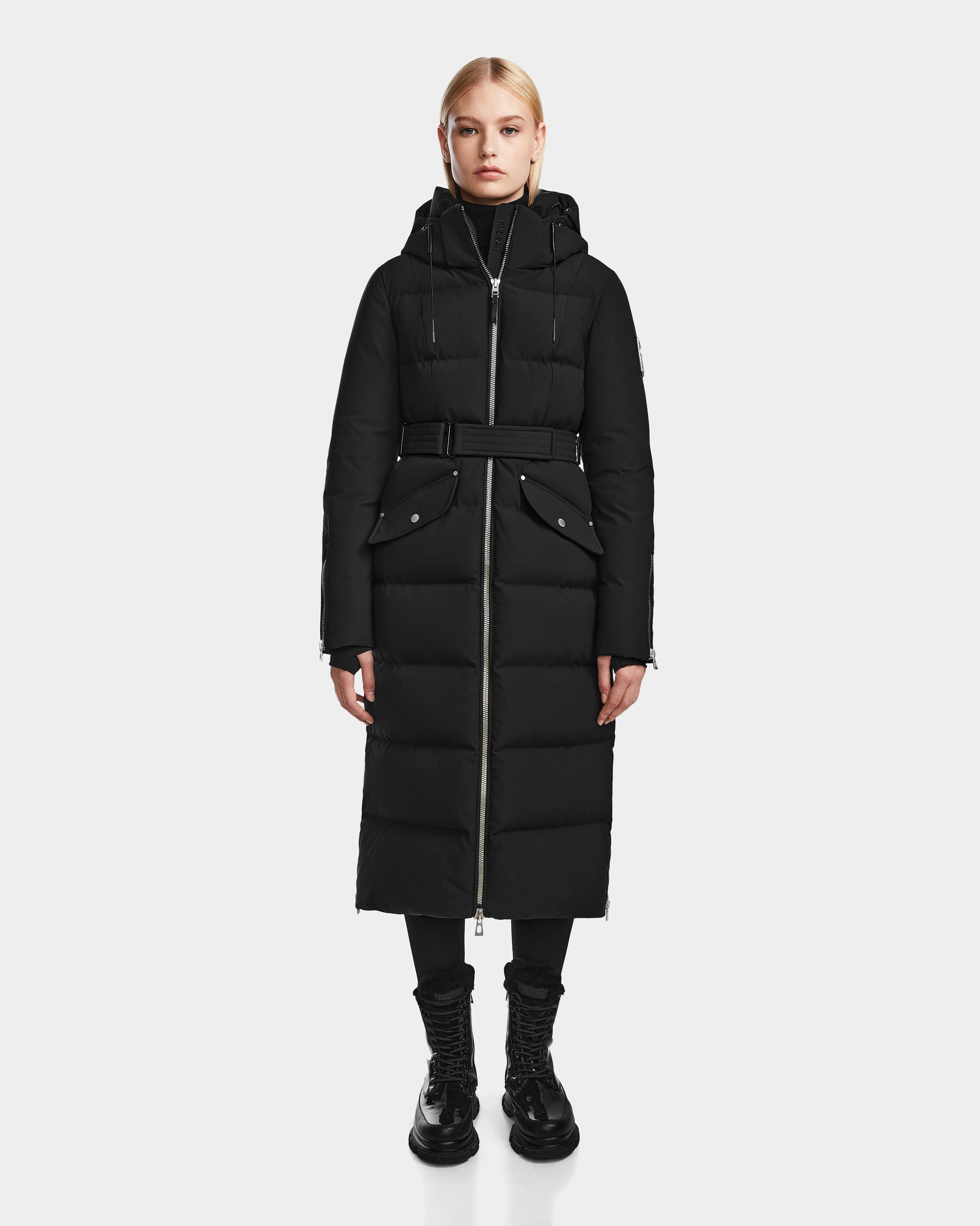 The CALI by RUDSAK is a maxi-length down puffer coat for women. Designed in our Stormshell fabric with a semi-gloss back panel, it's insulated with premium high-loft RDS-certified down fill and quilted down the body maximum warmth and comfort. It features a removable storm hood and branded visor, zip-expansion storm cuffs and an optional Velcro-closure belt for a tailored fit. Silver trim and heritage brand detailing add a striking style element, while the interior backpack straps and side vents give this fashion-forward piece a functional touch. Ultra-chic with a comfort level turned up on high, CALI is guaranteed to be your cold-weather go-to all winter long.