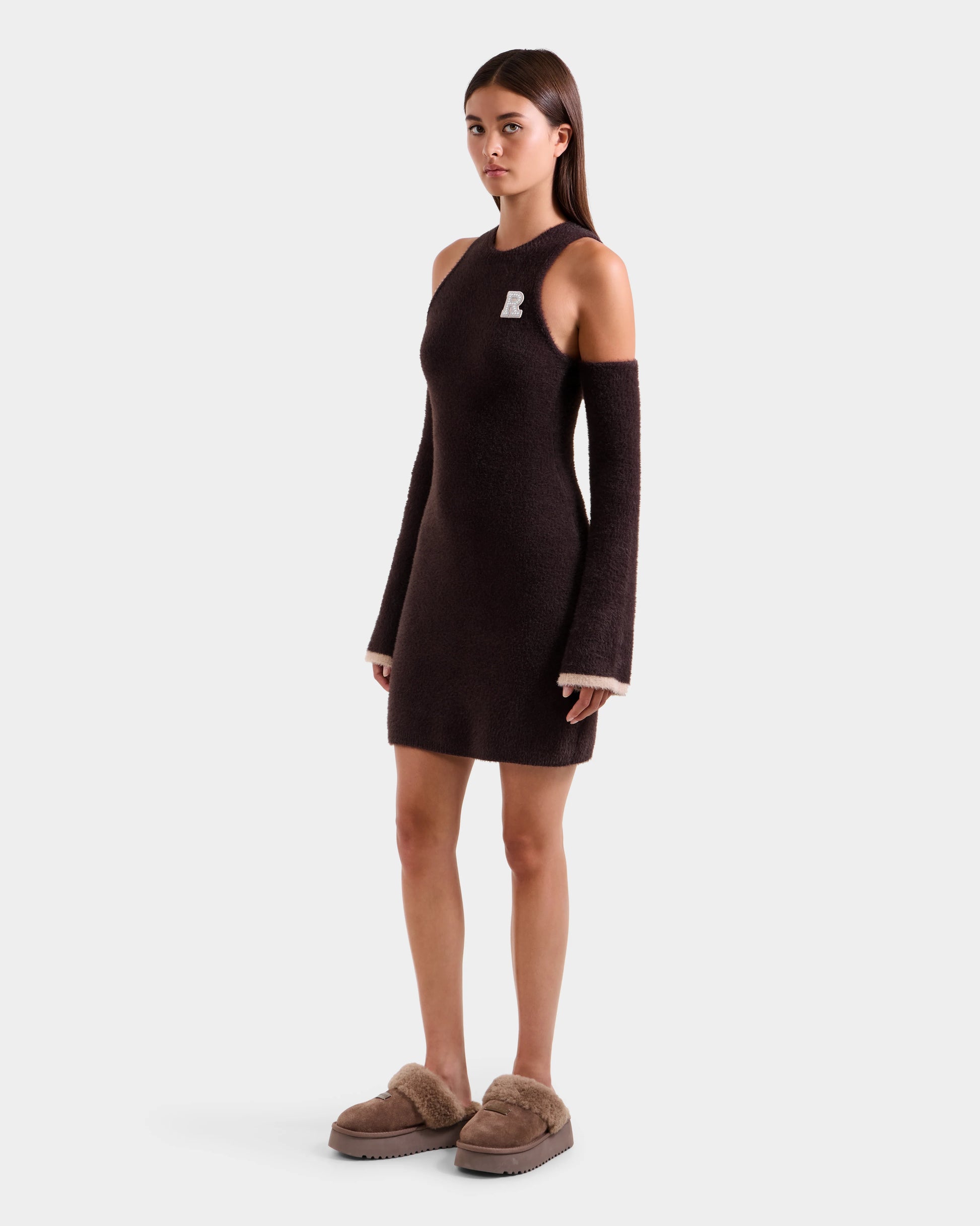 ZARAH by RUDSAK is a women’s fitted fuzzy knit dress designed for elevated casual dressing. Crafted from a textured, ultra-soft knit, it features a flattering body-hugging silhouette and removable long sleeves for versatile styling. A removable embellished R logo broach detail adds subtle edge. Perfect for après-ski lounges or chic off-duty moments, ZARAH blends cozy comfort with modern polish, making it a statement piece that elevates everyday wear.